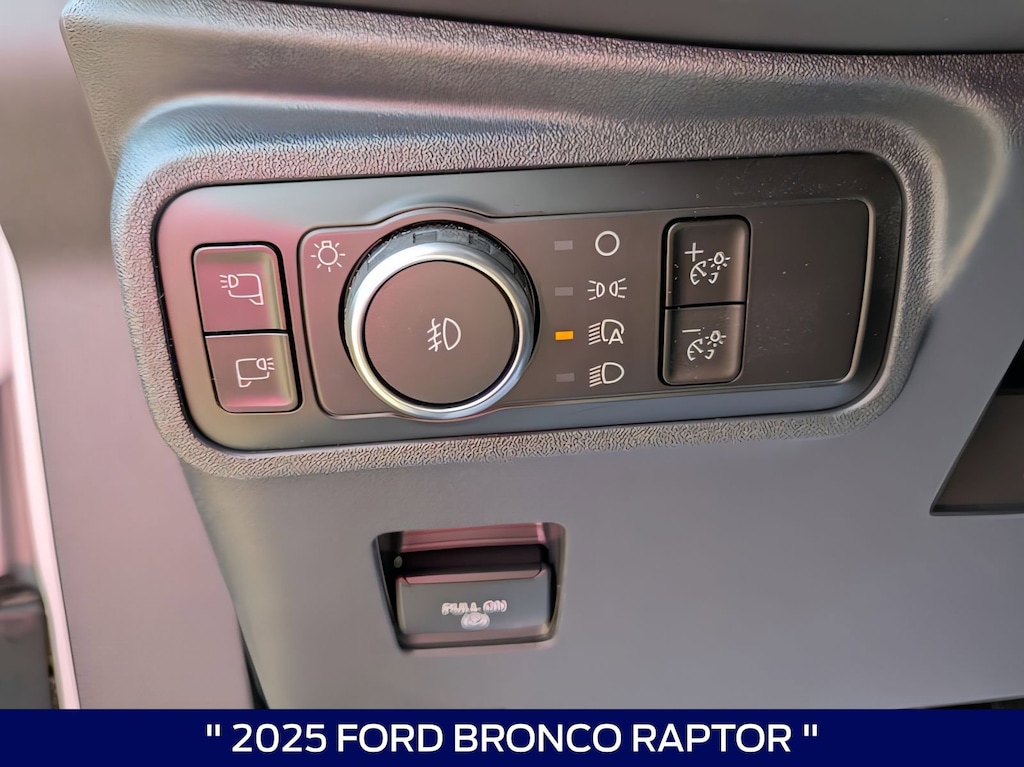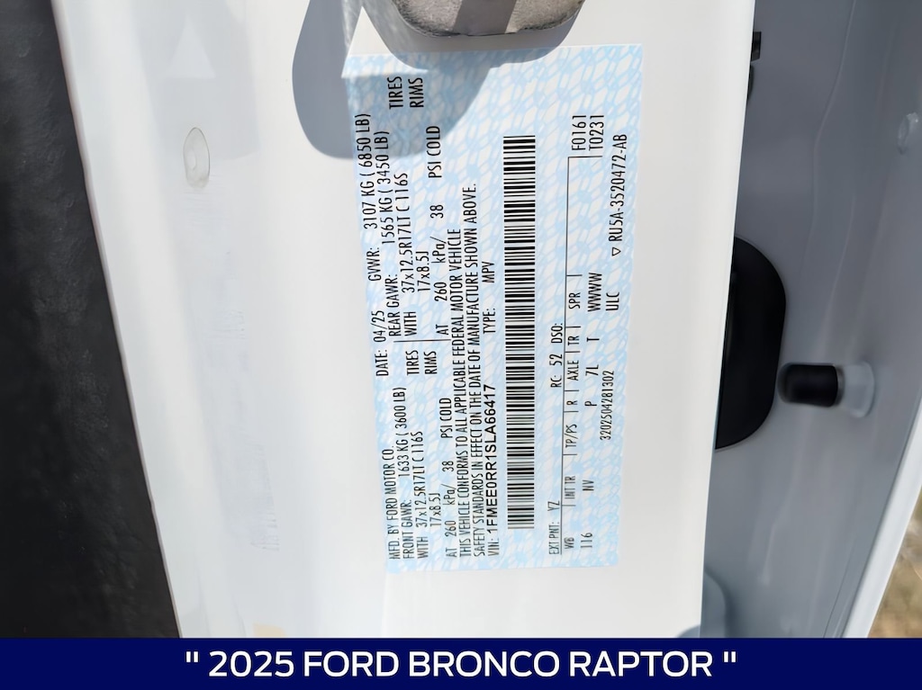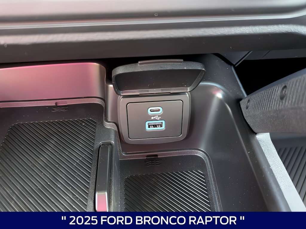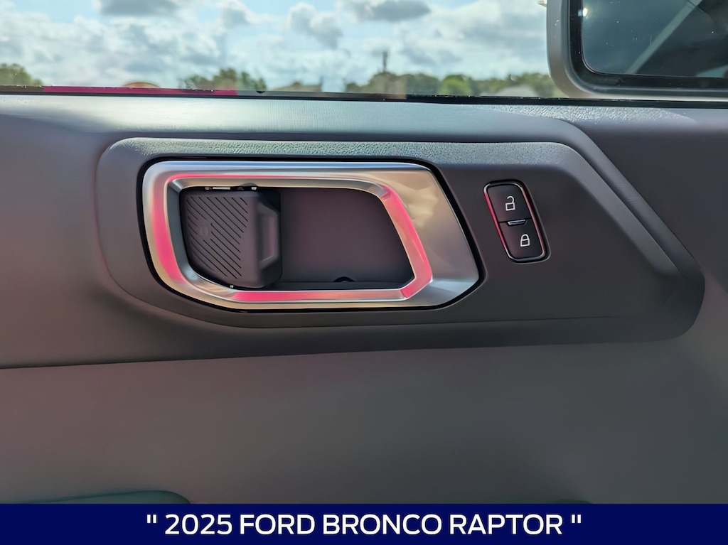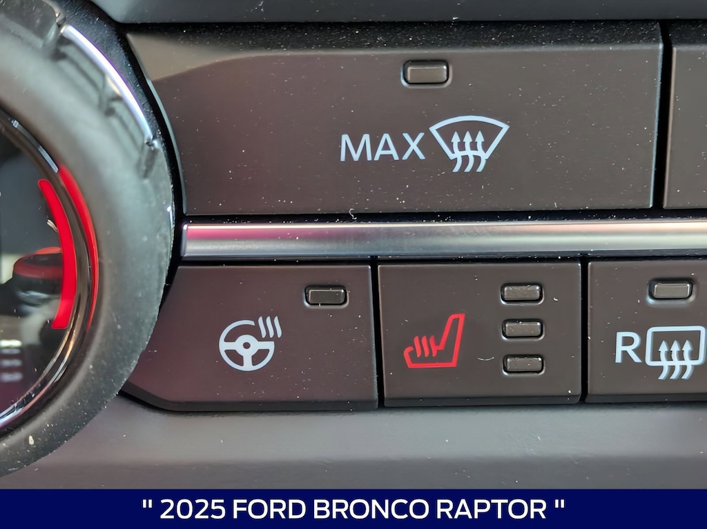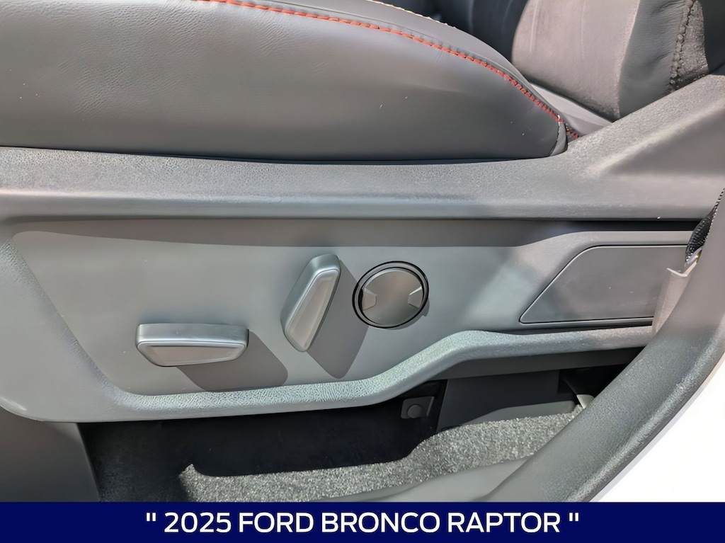 This 2025 Ford Bronco Raptor in Oxford White comes with the following features: 3.0L EcoBoost V6 10-Speed Automatic 4WD Bronco Raptor, Oxford White, and Black Onyx w/Leather-Trimmed/Vinyl Bucket Seats or Leather-Trimmed/Vinyl Bucket Seats w/Blue/Black Bronco Raptor, Oxford White, Black Onyx w/Leather-Trimmed/Vinyl Bucket Seats or Leather-Trimmed/Vinyl Bucket Seats w/Blue/Black, 12 Speakers, 4-Wheel Disc Brakes, ABS brakes, Air Conditioning, Alloy wheels, AM/FM radio: SiriusXM with 360L, Auto High-beam Headlights, Auto-dimming Rear-View mirror, Automatic temperature control, Brake assist, Compass, Connected Navigation, Convertible HardTop, Convertible roof lining, Delay-off headlights, Driver door bin, Driver vanity mirror, Dual front impact airbags, Dual front side impact airbags, Electronic Stability Control, Emergency communication system: 911 Assist, Exterior Parking Camera Rear, Front anti-roll bar, Front Bucket Seats, Front Center Armrest, Front dual zone A/C, Front fog lights, Front reading lights, Front wheel independent suspension, Fully automatic headlights, Garage door transmitter, Glass rear window, Heated door mirrors, Heated front seats, Heated steering wheel, Illuminated entry, Integrated roll-over protection, Leather Shift Knob, Low tire pressure warning, Marine Grade Vinyl Bucket Seats, Navigation system: Connected Navigation, Occupant sensing airbag, Outside temperature display, Overhead airbag, Overhead console, Panic alarm, Passenger door bin, Passenger vanity mirror, Power door mirrors, Power steering, Power windows, Radio data system, Radio: B&O Sound System by Bang & Olufsen, Rear anti-roll bar, Rear seat center armrest, Rear window defroster, Rear window wiper, Remote keyless entry, Security system, SiriusXM w/360L, Speed control, Split folding rear seat, Steering wheel mounted audio controls, SYNC 4, Tachometer, Telescoping steering wheel, Tilt steering wheel, Traction control, Trip computer, Turn signal indicator mirrors, Variably intermittent wipers, Voltmeter, and Wheels: 17" Black High Gloss-Painted Aluminum.