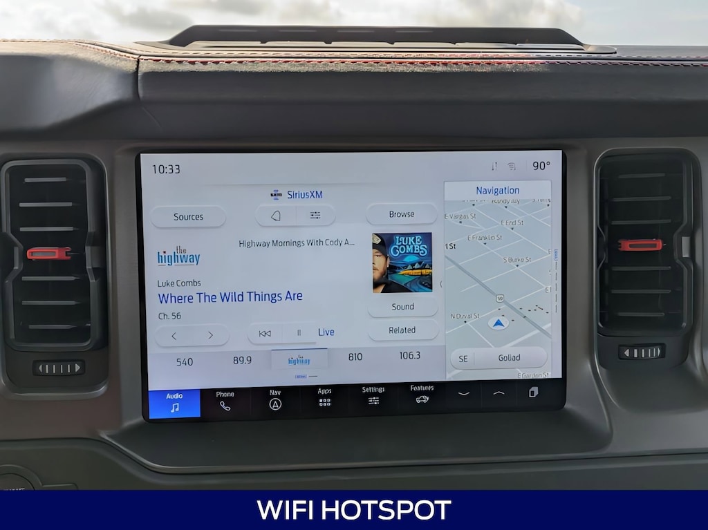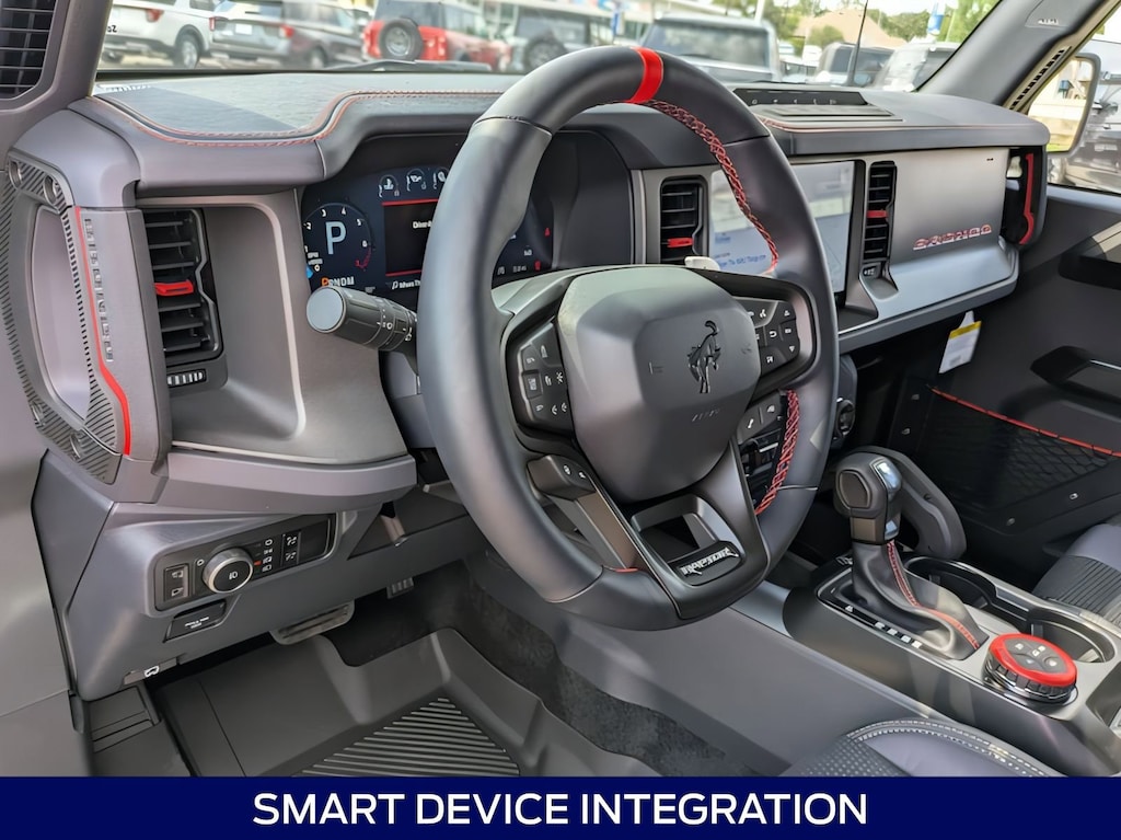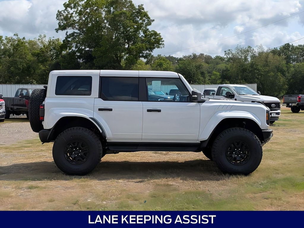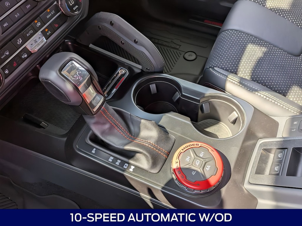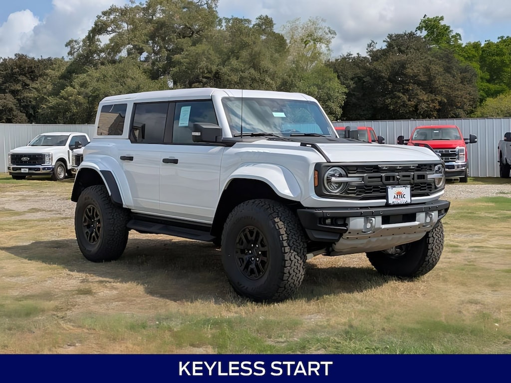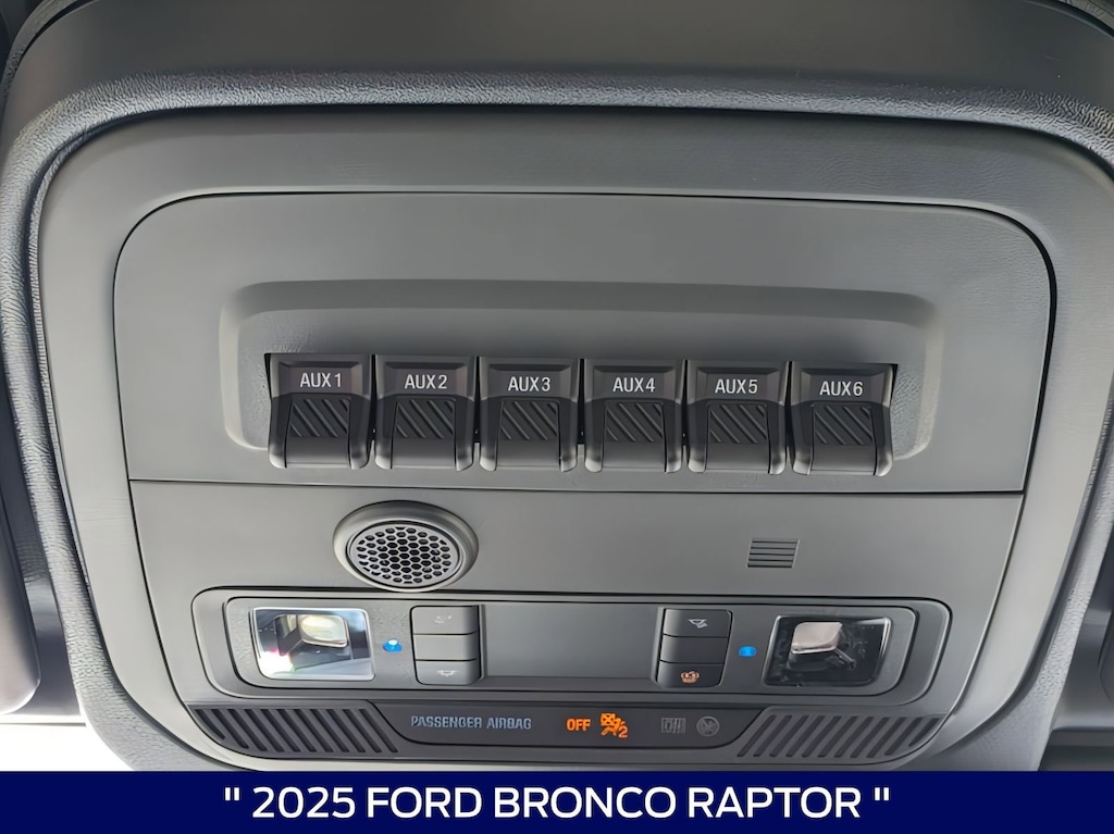 This 2025 Ford Bronco Raptor in Oxford White comes with the following features: 3.0L EcoBoost V6 10-Speed Automatic 4WD Bronco Raptor, Oxford White, and Black Onyx w/Leather-Trimmed/Vinyl Bucket Seats or Leather-Trimmed/Vinyl Bucket Seats w/Blue/Black Bronco Raptor, Oxford White, Black Onyx w/Leather-Trimmed/Vinyl Bucket Seats or Leather-Trimmed/Vinyl Bucket Seats w/Blue/Black, 12 Speakers, 4-Wheel Disc Brakes, ABS brakes, Air Conditioning, Alloy wheels, AM/FM radio: SiriusXM with 360L, Auto High-beam Headlights, Auto-dimming Rear-View mirror, Automatic temperature control, Brake assist, Compass, Connected Navigation, Convertible HardTop, Convertible roof lining, Delay-off headlights, Driver door bin, Driver vanity mirror, Dual front impact airbags, Dual front side impact airbags, Electronic Stability Control, Emergency communication system: 911 Assist, Exterior Parking Camera Rear, Front anti-roll bar, Front Bucket Seats, Front Center Armrest, Front dual zone A/C, Front fog lights, Front reading lights, Front wheel independent suspension, Fully automatic headlights, Garage door transmitter, Glass rear window, Heated door mirrors, Heated front seats, Heated steering wheel, Illuminated entry, Integrated roll-over protection, Leather Shift Knob, Low tire pressure warning, Marine Grade Vinyl Bucket Seats, Navigation system: Connected Navigation, Occupant sensing airbag, Outside temperature display, Overhead airbag, Overhead console, Panic alarm, Passenger door bin, Passenger vanity mirror, Power door mirrors, Power steering, Power windows, Radio data system, Radio: B&O Sound System by Bang & Olufsen, Rear anti-roll bar, Rear seat center armrest, Rear window defroster, Rear window wiper, Remote keyless entry, Security system, SiriusXM w/360L, Speed control, Split folding rear seat, Steering wheel mounted audio controls, SYNC 4, Tachometer, Telescoping steering wheel, Tilt steering wheel, Traction control, Trip computer, Turn signal indicator mirrors, Variably intermittent wipers, Voltmeter, and Wheels: 17" Black High Gloss-Painted Aluminum.