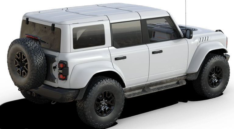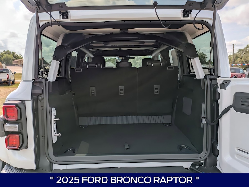 Oxford White 2025 Ford Bronco Raptor 4WD 10-Speed Automatic 3.0L EcoBoost V6 Bronco Raptor, Oxford White, Black Onyx w/Leather-Trimmed/Vinyl Bucket Seats or Leather-Trimmed/Vinyl Bucket Seats w/Blue/Black.