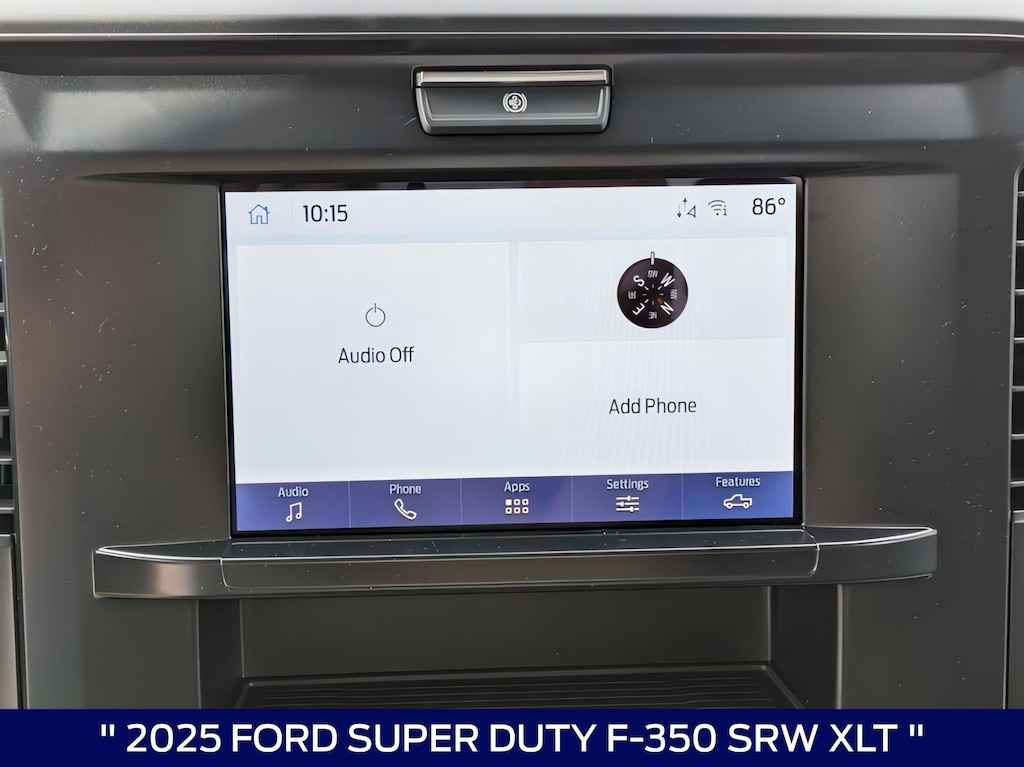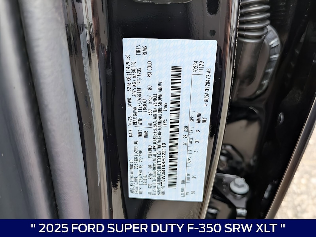 This 2025 Ford F-350SD XLT in Agate Black Metallic comes with the following features: Power Stroke 6.7L V8 DI 32V OHV Turbodiesel 10-Speed Automatic 4WD F-350 SuperDuty XLT, Agate Black Metallic, Medium Dark Slate w/Cloth 40/Console/40 Front Seats, ABS brakes, Alloy wheels, Compass, Electronic Stability Control, Heated door mirrors, Illuminated entry, Low tire pressure warning, Remote keyless entry, and Traction control F-350 SuperDuty XLT, Agate Black Metallic, Medium Dark Slate w/Cloth 40/Console/40 Front Seats, ABS brakes, Alloy wheels, Compass, Electronic Stability Control, Heated door mirrors, Illuminated entry, Low tire pressure warning, Remote keyless entry, Traction control, 190 Amp Alternator, 3.73 Axle Ratio, 4-Wheel Disc Brakes, 6 Speakers, Air Conditioning, AM/FM radio, Auto High-beam Headlights, Brake assist, Bumpers: chrome, Cloth 40/20/40 Split Bench Seat, Delay-off headlights, Driver door bin, Driver vanity mirror, Dual front impact airbags, Dual front side impact airbags, Emergency communication system: SYNC 4 911 Assist, Exterior Parking Camera Rear, Front anti-roll bar, Front Center Armrest w/Storage, Front fog lights, Front reading lights, Fully automatic headlights, Outside temperature display, Overhead airbag, Overhead console, Panic alarm, Passenger door bin, Passenger vanity mirror, Power door mirrors, Power driver seat, Power steering, Power windows, Privacy Glass, Rear reading lights, Rear step bumper, Security system, Speed control, Split folding rear seat, Steering wheel mounted audio controls, SYNC 4, Tachometer, Telescoping steering wheel, Tilt steering wheel, Trip computer, Turn signal indicator mirrors, Variably intermittent wipers, and Wheels: 18" Sparkle Silver Painted Cast Aluminum. Price includes: $1000 - Final Days Mega Bonus Cash. Exp. 01/02/2026 $2500 - Retail Customer Cash. Exp. 01/05/2026