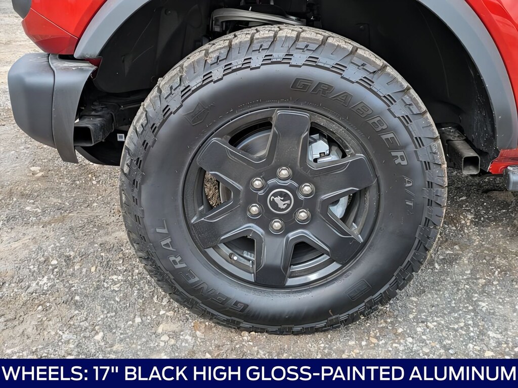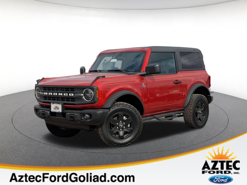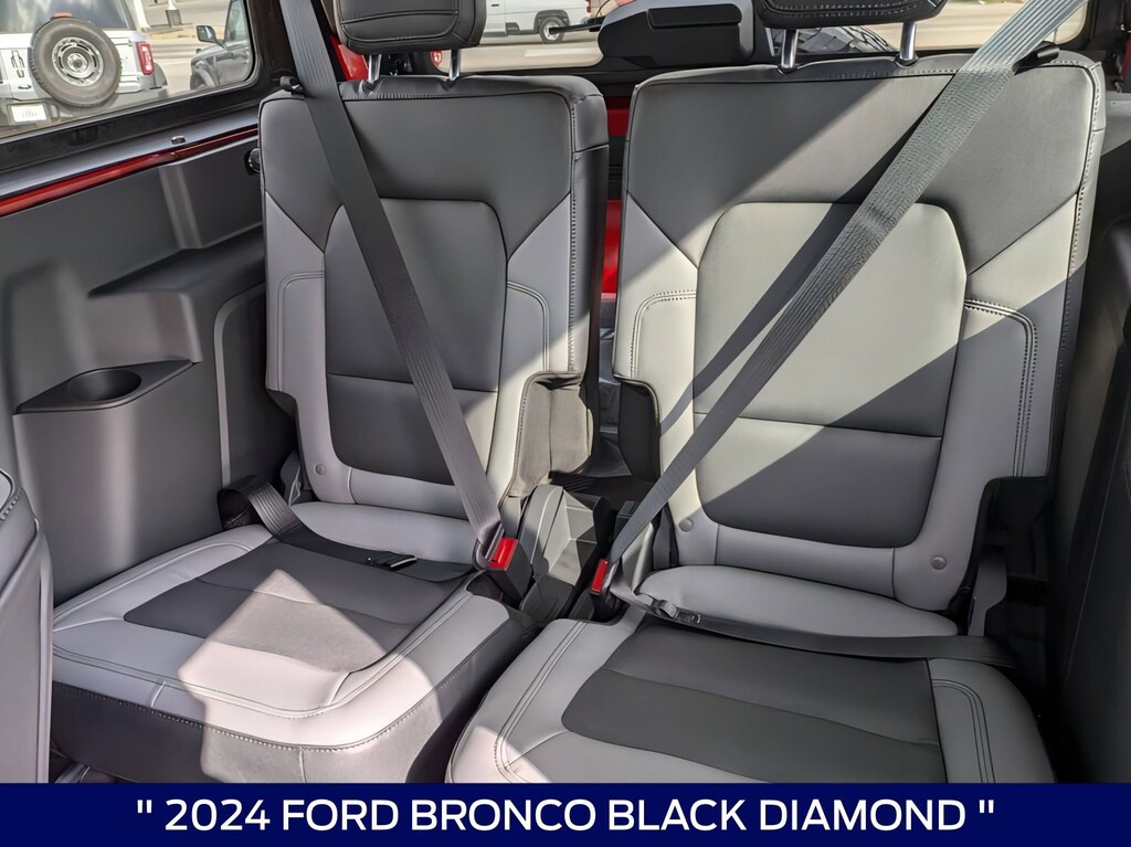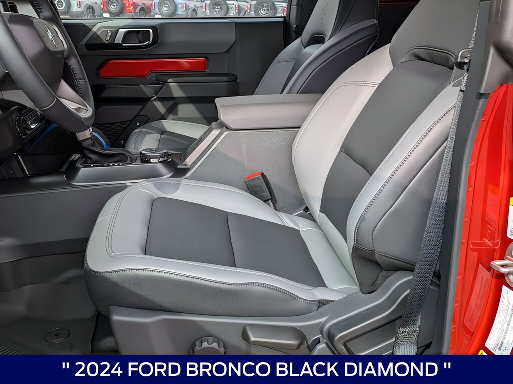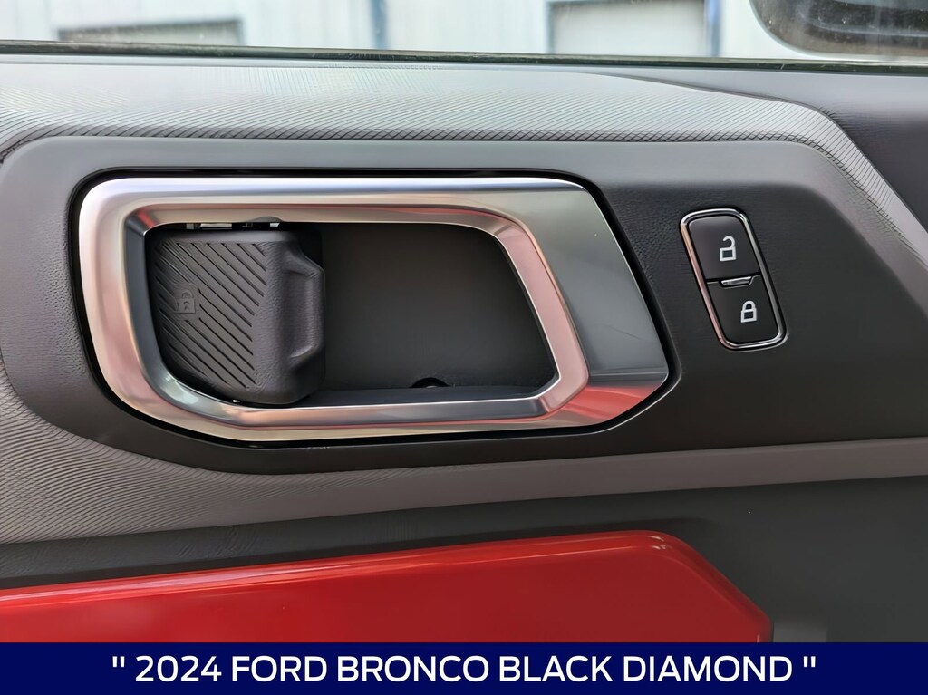 Hot Pepper Red Metallic Tinted Clearcoat 2024 Ford Bronco Black Diamond 4WD 10-Speed Automatic 2.3L EcoBoost I-4 Bronco Black Diamond, Hot Pepper Red Metallic Tinted Clearcoat, Dark Space Gray w/Black Onyx w/Marine Grade Vinyl Bucket Seats, 2-Door Intelligent Access w/Lock/Unlock, 4.46 Axle Ratio, 7 Speakers, AM/FM radio: SiriusXM with 360L, AM/FM Stereo, Ambient Footwell Lighting, Auto High-beam Headlights, Auto-Dimming Interior Rear-View Mirror, Brake assist, Connected Navigation, Convertible HardTop, Delay-off headlights, Dr & Pass Illuminated Sliding Visor Vanity Mirrors, Dual Smart Charging USB Ports, Dual-Zone Electronic Automatic Temperature Control, Electronic Stability Control, Equipment Group 322A Mid Package, Exterior Parking Camera Rear, Front Bucket Seats, Front Center Armrest, Front Row Heated Seats, Fully automatic headlights, Illuminated entry, Leather Shift Knob, Marine Grade Vinyl Bucket Seats, Panic alarm, Power Outlet - Back Side of Center Floor Console, Power steering, Power windows, Radio data system, Rear Parking Sensors, Rear window wiper, Remote keyless entry, Remote Start System, Security system, SiriusXM Radio w/360L, Split folding rear seat, Steering wheel mounted audio controls, SYNC 4, Telescoping steering wheel, Tilt steering wheel, Variably intermittent wipers, Wheels: 17" Black High Gloss-Painted Aluminum.